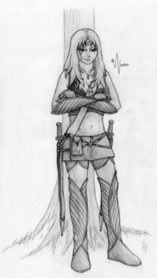 She is of medium height at 5'5 with long flowing hair down past her shoulders, dyed black from her natural baby blonde colour which she felt made her look too young. Her eyes are dark blue and show well against her pale complexion, her lips are often a rosy red colour. There are several scars on her, two faint claw marks on her face one on her forehead and the over on her cheek which have faded with time, her back is marked with several deep scares making a H and X shape, and she is missing the ring finger of her left hand. She has an athletic build about her with slightly muscled arms but not overly so, her body is a feminine shape that shows well in her female Waywatcher uniform.