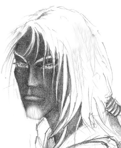 An almost 2 meters tall man stands in front of you with wide arms and shoulders he doesn’t seem to be too heavy but still muscular built. He seems to be gazing into your eyes. His face seems stern, emotionless until a slight smile appears on one corner of his lips. He now regards you with friendly look. His cheekbones seem to be more visible than most other people. White locks of hair floats about playfully in the wind giving his face a small contrast of dark and light. Two emerald bright eyes can be seen shining out from his dark toned skin as well looking at you up and down with a bright green light. Smaller scars can be found on his face, probably caused from years of fighting. On the left side of his belt there’s a kryss attached, it seems to be well tended to along with the bow that’s resting over his shoulder. On the back he has a cloak attached wearing the marksman uniform with pride. Can often be seen leaning against a wall or on his shepherds crook.