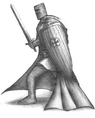 The great, immensely built body of Sir Hugo gives him an unstoppable, fierce appearance. It is obvious to anyone that this man lets nothing get in his way. His solemn, grey eyes, his mighty, but gracious figure and noble but ruthless bearing show his sycophantic confidence. When clad in his monkrobe, he looks like any other of the wise and eldered scholars, with the black hair and wrinkled face of a middle-aged male. But in his suit of war, in chain and plate armour, shortsword, and with a cross-marked shield, he is the tower of a man, proud and mighty. The deep voice is overly calm, noble and rational, the movement swift, but determined.